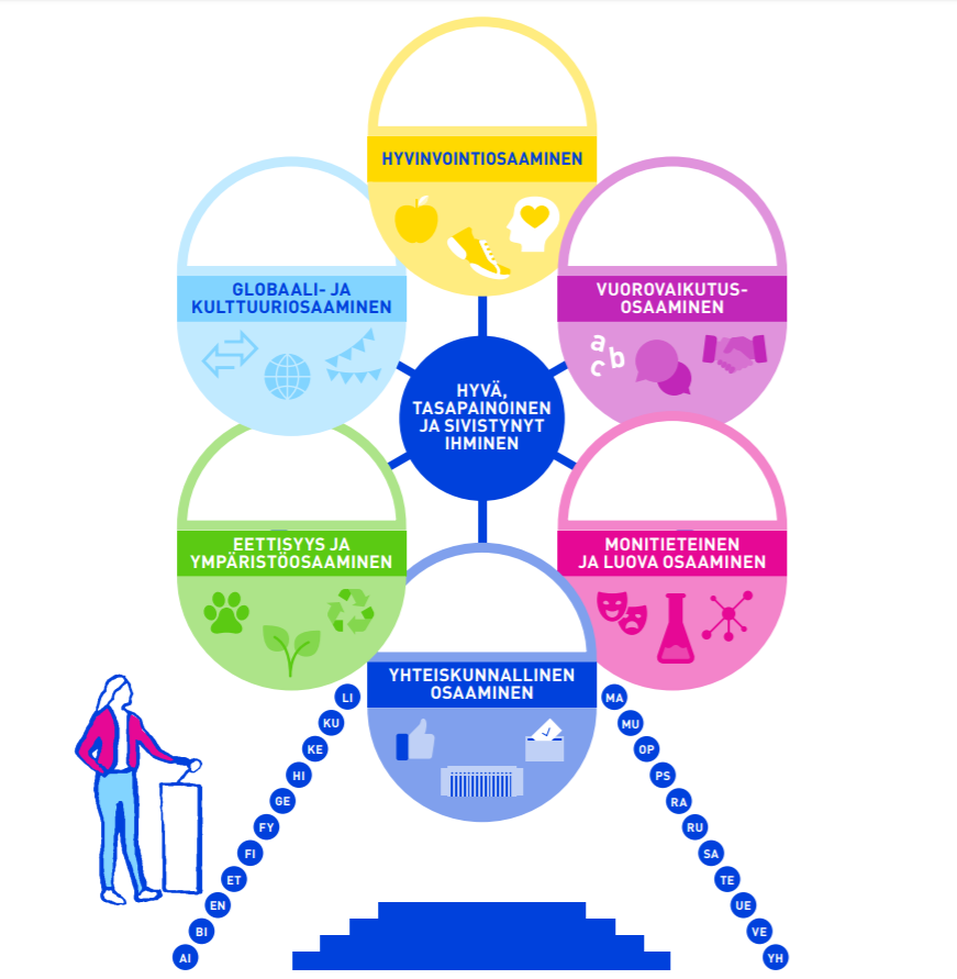 Laaja-alainen osaaminen käsittää opiskelijan hyvään yleissivistykseen ja hyväksi ihmiseksi kasvamiseen, kestävän tu¬levaisuuden rakentamiseen sekä jatko-opinto-, työelämä- ja kansainvälisyysvalmiuksiin tarvittavien tietojen, taitojen, arvojen, asenteiden ja tahdon muodostaman kokonaisuuden.